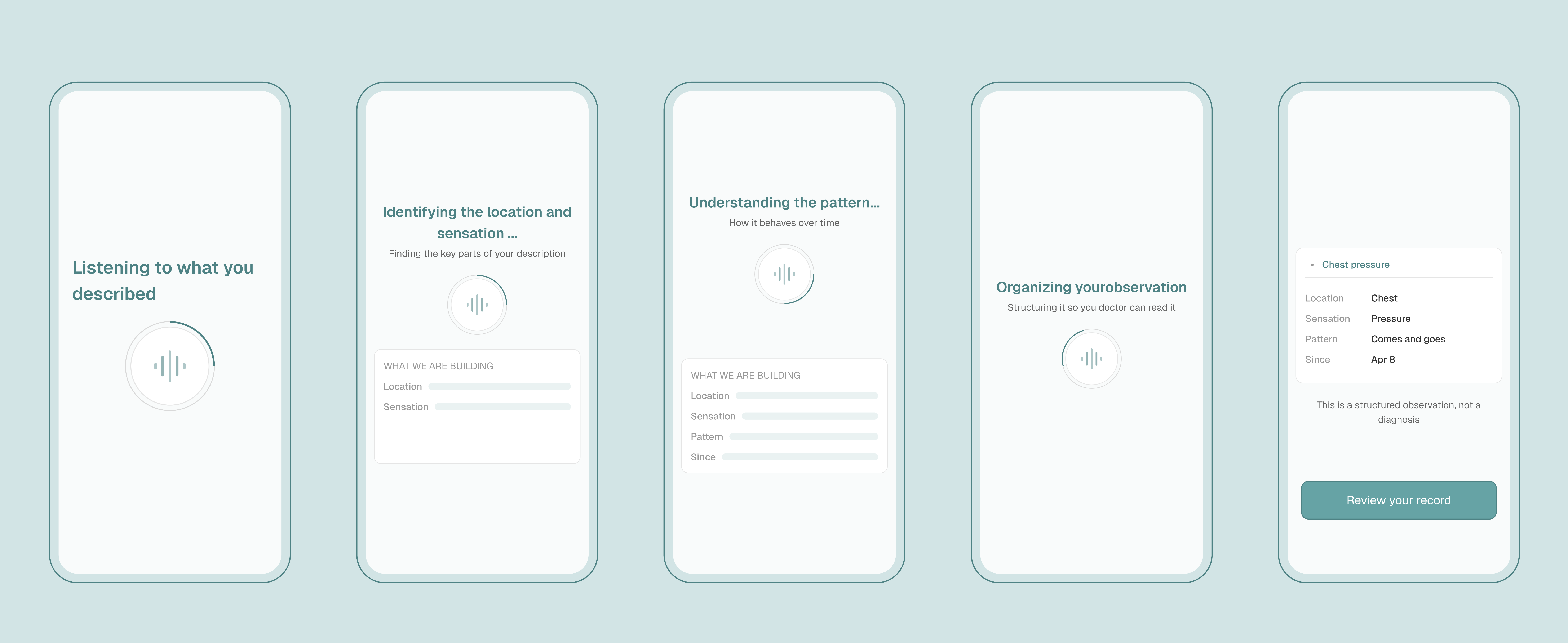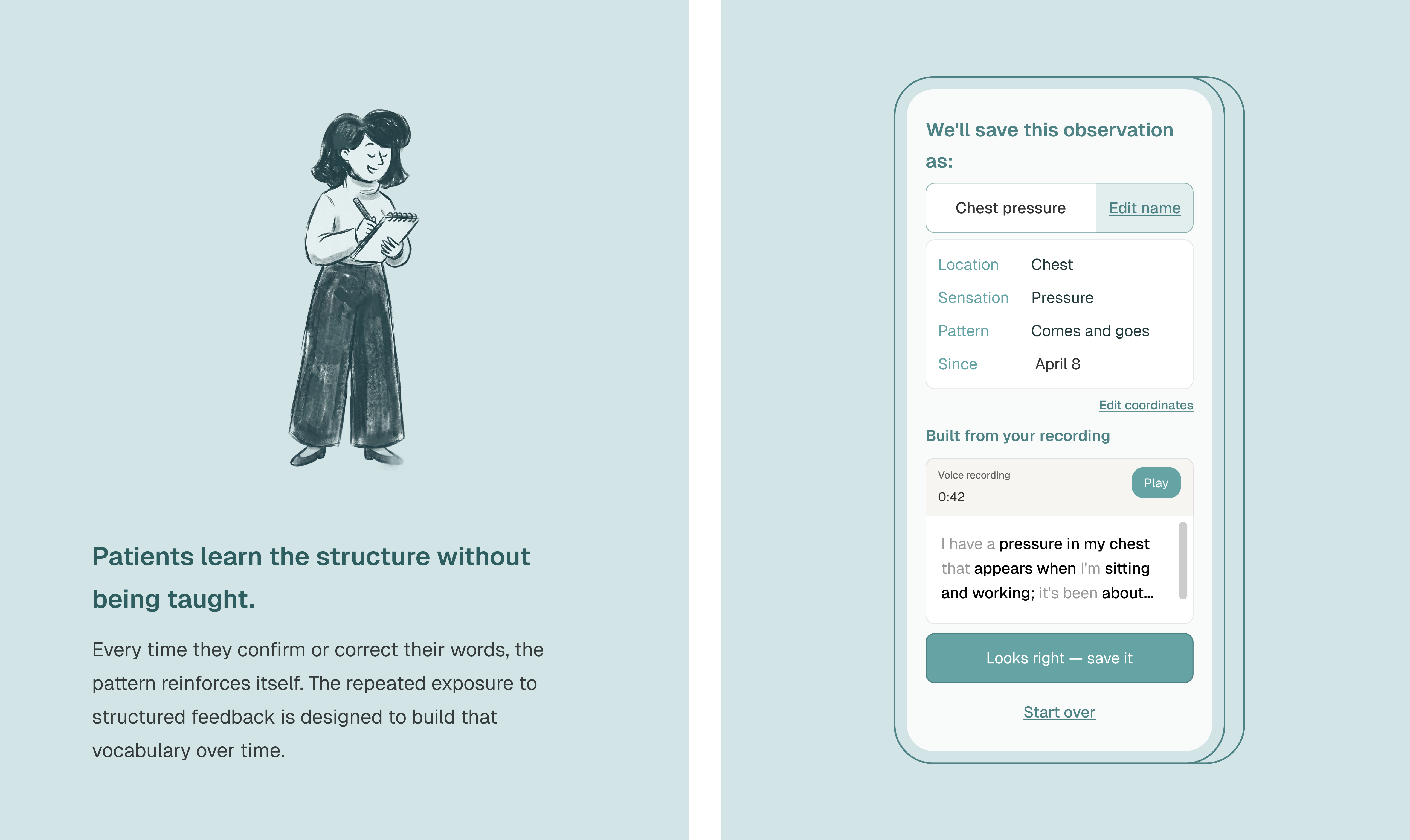 Writing under stress requires rational processing that anxiety often suppresses; speaking has lower friction. The app builds clinical vocabulary as a side effect of use.