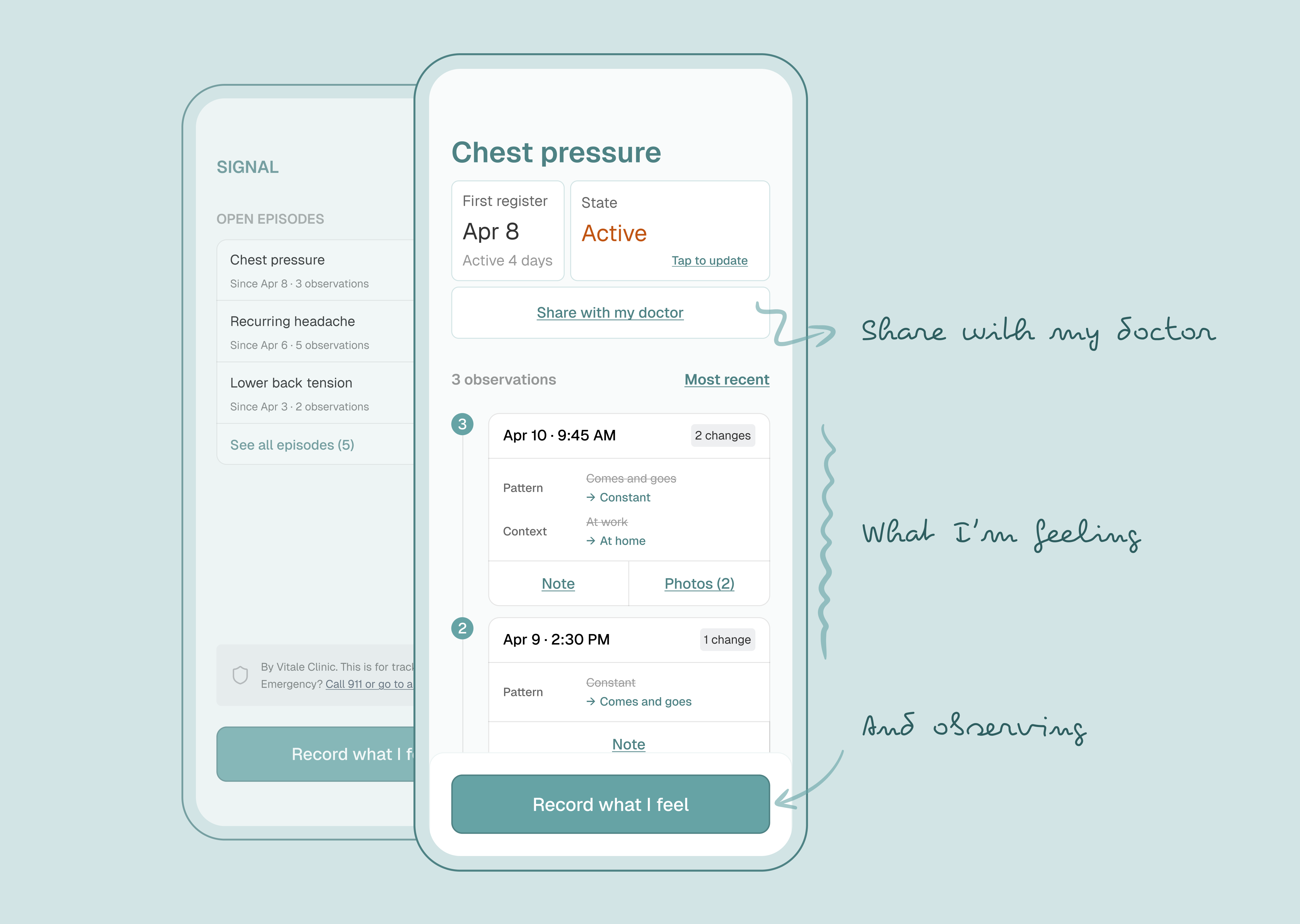 A single symptom is just a data point; a sequence is a picture. By striking through old values and highlighting new ones, the interface trains the patient to read their own patterns of evolution without needing clinical terms.